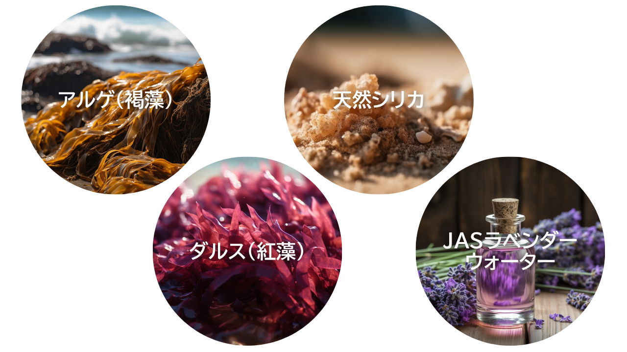 ダルス(紅藻):ミネラル豊富な海藻で、髪と頭皮をやさしく包みます。